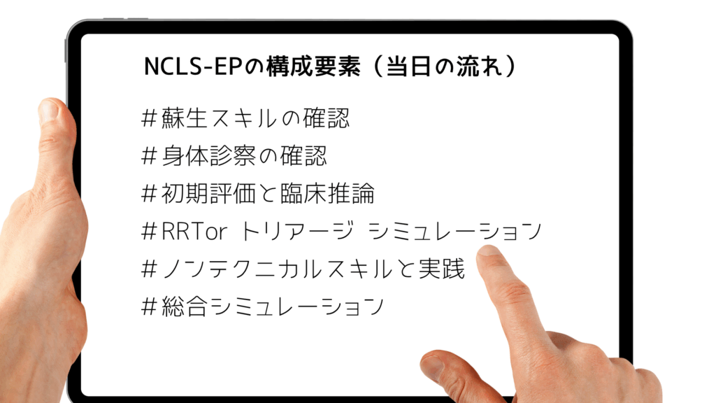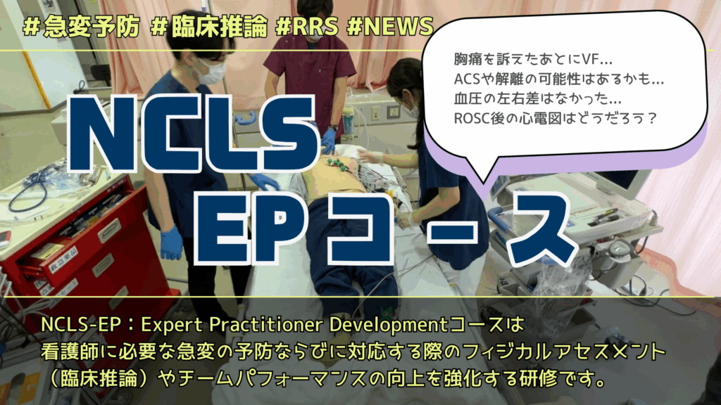 NCLS-EP: Expert Practitioner Developmentは「NCLS」がカバーする看護師に必要な急変対応の基礎を土台に、より高度な臨床判断・状況適応と、チームのパフォーマンス向上に焦点を当てます。基礎コース同様にシミュレーション中心ですが、「心停止前後の評価・判断」、「臨床推論や緊急度の判断」、「RRTメンバーとしての立ち振舞いやチームパフォーマンス向上につながる行動」などに特化しています。